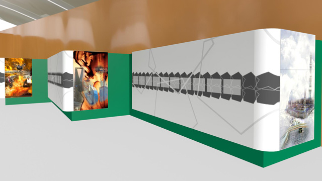 The square acts as a traditional basic pattern of the arabic culture. It used in a carpet underneath the exhibition elements und could build a semantic clamp around it. While walking around in the exhibition, people will also raise their heads to have a look at the ceiling - a big projection in the same size and position like the carpet on the floor will be shown. The graphics in the ?sky? should provide a nice ambience to the whole hall. Animated cloudy skies where a picture of King Fahd appears, relevant texts, sayings and phrases in arabic will flow over it.
